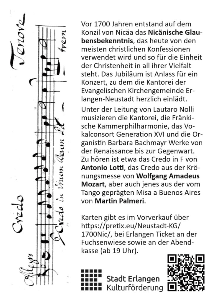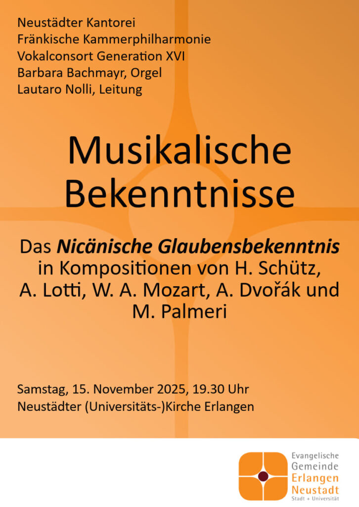 Die Neustädter Kantorei gibt ein Konzert anlässlich des Jubiläums des Nicänischen Glaubensbekenntnisses. Herzliche Einladung am 15. November 2025 um 19.30 Uhr in der Neustädter Kirche